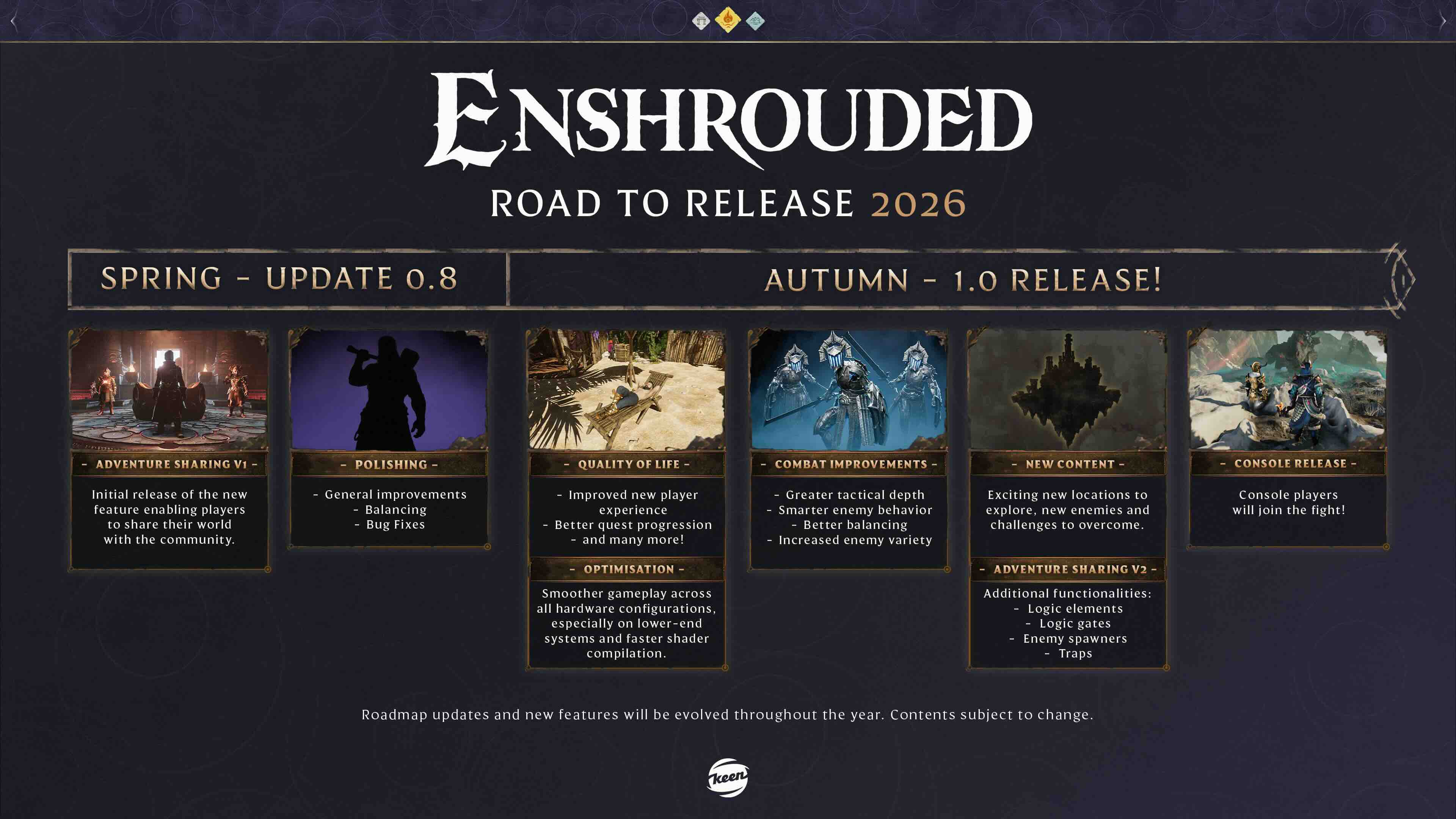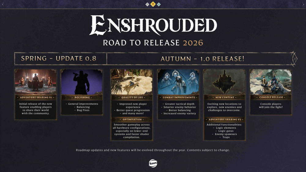 Frankfurt am Main, 21. Januar 2026 – Wenige Tage vor dem zweiten Jubiläum des Early Access Start von Enshrouded geben Keen Games bekannt, dass die Version 1.0 im Herbst 2026 erscheinen soll. Zur optimalen Vorbereitung auf die Vollversion wird ein letztes großes Inhaltsupdate für den Early Access Build veröffentlicht, welches Adventure Sharing sowie zahlreiche Verbesserungen enthalten wird. Vollständige Details dazu werden zu einem späteren Zeitpunkt bekanntgegeben. Zur Vorstellung dieser Updates hat das Team ein neues Entwickler-Tagebuch sowie eine Roadmap veröffentlicht.