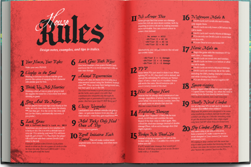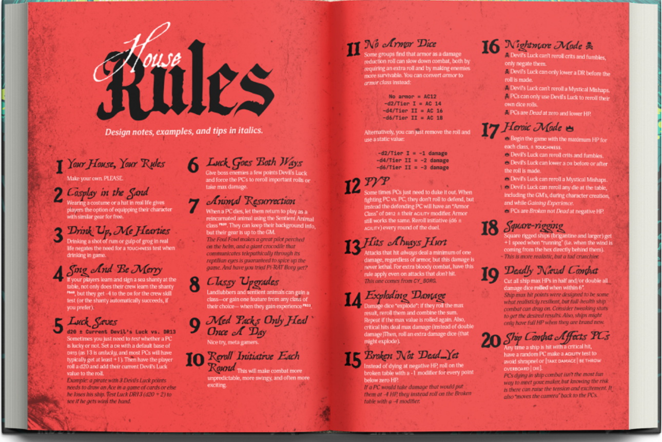 For the Gamemaster, their side of the screen is embellished with all the necessary information needed, including NPC and vessel name generators, quick pirate and ship stat blocks, ASH and gear tables, ritual and relic rules, a ship diagram, naval combat stats, core rules references, and more.
